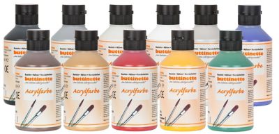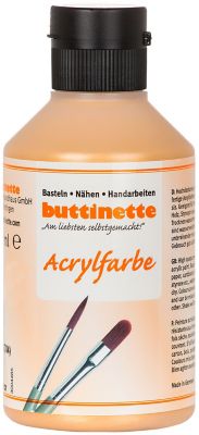 buttinette Acrylfarbe, zum Grundieren und Bemalen von Keilrahmen, Terrakotta, Papier, Holz usw., hochdeckend, wasserverdünnbar, Farben können miteinander vermischt werden. Inhalt: 250 ml.