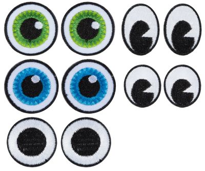 buttinette Applikationen "Augen-Mix" zum Aufbügeln und/oder Aufnähen. Größe: 2,1–3,0 cm, Inhalt: 10 Stück (5 Paar). Material: 100 % Polyester.