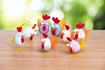 Basteln Sie mit diesem Set in nur wenigen Schritten acht lustige Hühner. Sie können diese nach Belieben bemalen und verzieren. Im Handumdrehen macht sich Ihre Hühnerschar nun auf dem Fensterbrett, in der Tischdeko oder auch im Osternest breit.