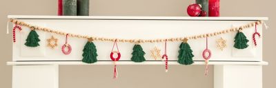 Bastel-Set "Weihnachts-Girlande" exklusiv von buttinette, der Inhalt ist ausreichend zum Basteln einer ca. 1 m langen Girlande mit 14 Anhängern, Inhalt: Wolle in Weiß, Rot und Grün, 8x MDF Sterne, 180 Holzperlen 8–15 mm, 3 Holzringe 40 mm, ein Stück Baumwollseil 6 mm Ø, ein Steckdraht sowie eine ausführliche Anleitung.