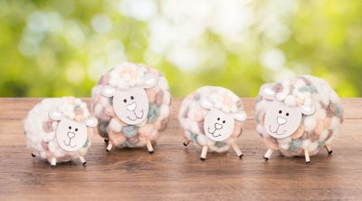 Bastel-Set "Wollschafe", exklusiv von buttinette, zum Basteln von 2 kleinen und 2 großen Wollschafen in den Größen 6 x 8 cm und 7,5 x 9,5 cm. Inhalt: 4 Styroporeier, Holzstäbchen, Filzwolle in Lachs, Salbei, Taupe und Natur, 4 Köpfe aus Holz und eine Anleitung.