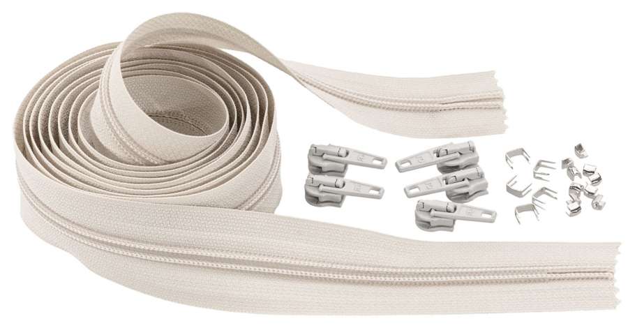 buttinette Endlosreißverschluss im Set, mit breiter Spirale, nicht teilbar, Farbe: hellgrau, Breite: Spirale 6,5 mm, Band 30 mm, Länge: 2 m, inkl. 5 Schieber, 10 Anfangsstopper und 5 Verbinder. Material: Band aus 100 % Polyester, Spirale aus Kunststoff, Schieber aus Metall.