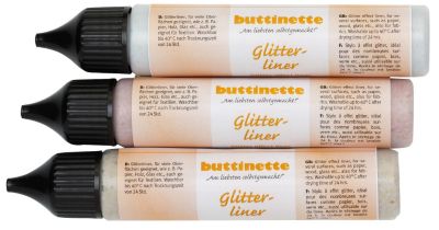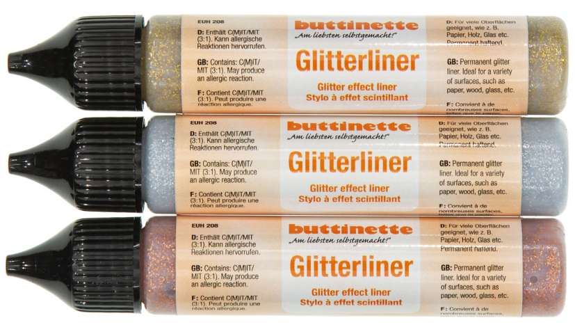 buttinette Glitterliner-Set, auf Wasserbasis, für viele Oberflächen geeignet, wie z.B. Papier, Holz, Glas etc.. Inhalt: 3x 28 ml, Farben: gold, silber, kupfer.
