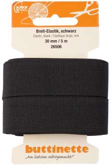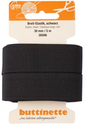 buttinette Gummiband "Breit-Elastik", Farbe: schwarz, Breite: 30 mm, Länge: 5 m. Material: 68 % Polyester, 32 % Elastodie.