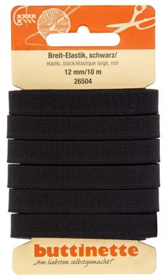 buttinette Gummiband "Standard-Elastik", Farbe: schwarz, Breite: 12 mm, Länge: 10 m. Material: 68 % Polyester, 32 % Elastodie.