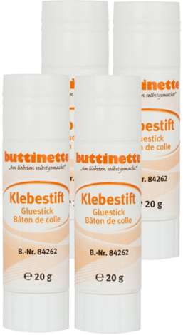 buttinette Klebestift, lösungsmittelfreier Klebestift für Papier, Fotos, Pappe uvm. Klebeflächen müssen trocken, sauber und fettfrei sein, mit Wasser auswaschbar. Inhalt: 4 Stück á 20 g.