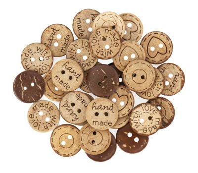 buttinette Kokosnuss-Knöpfe "handmade", Farbe: braun, 4 Designs (7–8 Stück je Design), Größe: 18 mm Ø, Inhalt: 30 Stück. Material: Kokosnuss. Handwäsche.