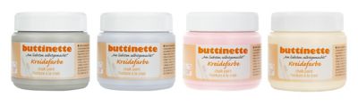 buttinette Kreidefarben, zum Bemalen von Holz, Ton, Styropor, Glas und vielem mehr. Auf Glas ist die Farbe nicht kratzfest und nur zu Dekozwecken geeignet. Set in den Farben Vanille, Vintage Blau, Vintage Grün und Rosé, Inhalt: 4x 150 ml.