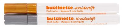 buttinette Kreidestifte, für glatte Oberflächen geeignet. Der Kreidemarker ist feucht abwischbar und auf Wasserbasis. Strichstärke 1–2 mm, Farbe: gold und silber.