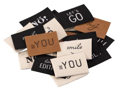 buttinette Label-Set "Mix", mit frechen Schriftzügen, zum Annähen und/oder Aufkleben mit Textilkleber. Mit diesem Set erhalten Sie 16 Weblabels und 4 Labels in Lederoptik. Farbe: weiß/schwarz/braun, Größe: 4 x 3 cm, Inhalt: 20 Stück in 8 unterschiedlichen Designs. Material: Stofflabels 100 % Polyester, Kunstlederlabels 100 % Polyurethan.
