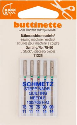 buttinette Nähmaschinennadeln "Quilting", in Flachkolben-Ausführung. Stärke: 3x 75, 2x 90, Inhalt: 5 Stück. Material: Stahl.