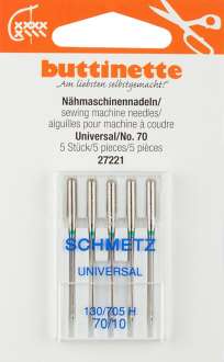 buttinette Nähmaschinennadeln "Universal" in Flachkolben-Ausführung, für verschiedene Stoffqualitäten. Stärke: 70, Inhalt: 5 Stück. Material: Stahl.