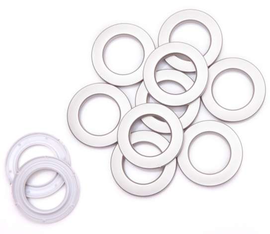 buttinette Ösen, besonders für Vorhänge geeignet, Farbe: Edelstahl-Optik, Größe: 4,5 cm Ø (außen), 2,8 cm Ø (innen). Material: Kunststoff.