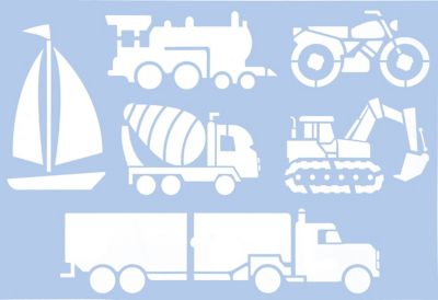 buttinette Schablone "Fahrzeuge" aus Kunststoff, Farbe: transparent, Größe: 29,5 x 20 cm, Motivgröße: 4,5–21 cm, 6 Motive.