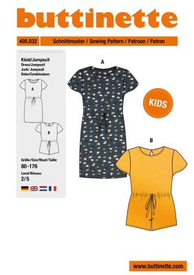 Schnitt "Kleid/Jumpsuit" für Kinder, exklusiv von buttinette, Anleitung für 2 Modelle, Größe: 80–176, Schwierigkeitsstufe: 2/5, Stoffempfehlung: Jersey, Sommersweat, leichte Strickstoffe.