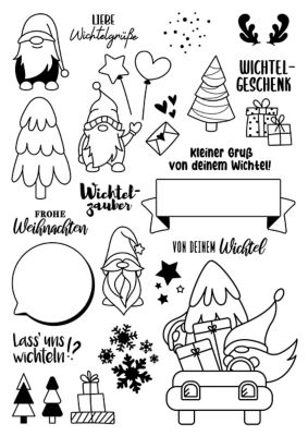Silikonstempel "Wichtel", exklusiv von buttinette, zum Basteln von individuellen Karten, für jeden Anlass den richtigen Stempel, Motivgröße: 0,9–7,4 cm, Inhalt: 27 Motive.