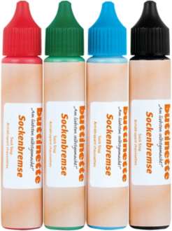 buttinette Sockenbremsen "Grundfarben", Farben: rot, grün, blau und schwarz, Inhalt: 4x 30 ml.