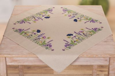 buttinette Stickmitteldecke "Lila Gartenpracht", zum Besticken in Stiel-, Knötchen-, Margeriten- und Plattstich. Vorgedrucktes Motiv, randfertig gesäumt. Komplettpackung: Anleitung, Garn, Sticknadel. Stofffarbe: leinen. Größe: 72 x 72 cm. Material: Stoff und Garn 100 % Baumwolle.