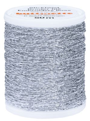 buttinette Sticktwist "Metallic", 10-fädig, Farbe: silber, 50 m pro Spule. Material: 60 % Polyester, 40 % Polyamid.