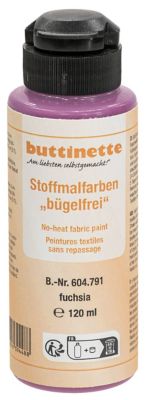 buttinette Stoffmalfarbe bügelfrei für helle und dunkle Baumwoll- und Leinentextilien mit max. 25 % Kunstfaseranteil, ohne Bügelfixierung waschbeständig bis 30 °C, Inhalt: 120 ml.