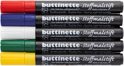 buttinette Stoffmalstifte-Set, geeignet für dunkle Textilien, waschbeständig bis 30° C nach Bügelfixierung bei Baumwolltemperatur, Strichstärke: 2 - 4 mm, Inhalt: 5 Stifte in den Farben Rot, Gelb, Weiß, Blau und Grün.