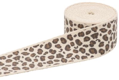 buttinette Taschengurtband "Leo", Farbe: braun/schwarz, beidseitig bedruckt, Stärke: 1,8 mm, Breite: 4 cm, Länge: 2 m. Material: 100 % Baumwolle.
