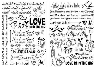 Transfermotive "Hochzeit", exklusiv von buttinette, zur Verzierung von glatten Oberflächen wie z. B. Kerzen und Glas verwendbar, Motivgröße: 1–13,5 cm, Inhalt: 2 Bogen in der Größe DIN A5.