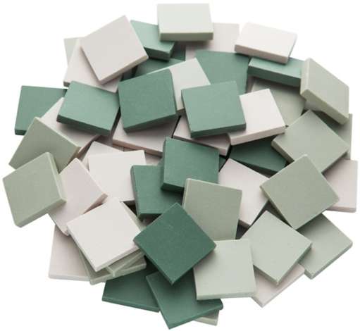 Ceraton-Mosaik grün-mix, frost- und hitzebeständig, Farbe: verschiedene Grüntöne sowie creme, Größe: 20 x 20 mm, Stärke: 4 mm, Inhalt: 280 g = ca. 70 Stück. Ausreichend für eine Fläche von ca. 19 x 19 cm.