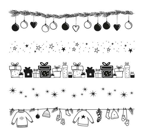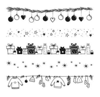 Transparentes Clear Stempel-Set "Weihnachtsbordüren", zum Basteln individueller Karten, zum Verzieren von Geschenkanhängern uvm. Gesamtgröße: 10,2 x 9,7 cm, Motivgröße: Bordürenlänge 9,7 cm, Höhe 1 – 1,5 cm, Inhalt: 5 Motive.