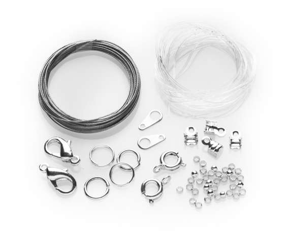 Collier- & Armband-Set, Inhalt: Elastikfaden 1 m, 4 Endteile 4 mm, Stahldraht 2 m, 30 Quetschperlen 2 mm, 2 Springring-Sets, 2 Karabiner-Sets. Material: Messing.
