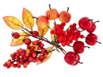 Deko-Herbstfrüchte, Größe: Äpfel 3 cm Ø, Beeren 1 cm Ø, Blätter 5 cm, Inhalt: 9 Äpfel, 2 Pick Beeren, 1 Pick Hagebutten und 1 Pick herbstliche Blätter = 13 Stück.