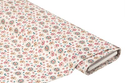 Dekostoff "Blumen Felice" aus der Serie Lorena, Farbe: naturgrundig, Motivgröße: 1–3,5 cm Ø, Breite: 140 cm, Gewicht: ca. 170 g/m². Material: 70 % Baumwolle, 30 % Polyester.
