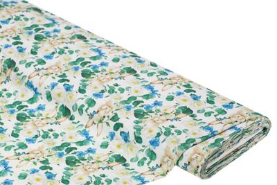 Dekostoff "Hase mit Blätterranken" aus der Serie Lorena, Farbe: natur-color, Motivgröße Hase: 8 x 4 cm, Breite: 140 cm, Gewicht: ca. 170 g/m². Material: 50 % Baumwolle, 50 % Polyester.