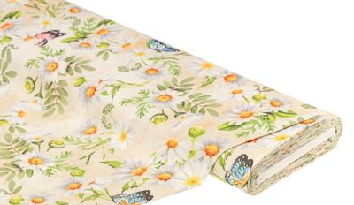 Dekostoff "Margeriten" aus der Serie Lorena, Farbe: weiß-color, Motivgröße Schmetterling: 4 x 6 cm, Breite: 140 cm, Gewicht: ca. 170 g/m². Material: 50 % Baumwolle, 50 % Polyester.