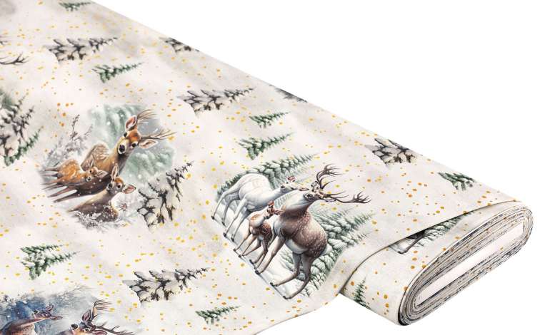 Dekostoff "Rehfamilie Winterland" aus der Serie Lorena, Farbe: natur-color, Breite: 140 cm, Gewicht: ca. 170 g/m². Material: 70 % Baumwolle, 30 % Polyester.
