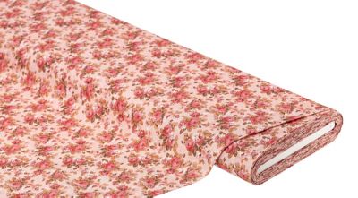 Dekostoff "Röschen" aus der Serie Lorena, Farbe: rosagrundig, Motivgröße Röschen: 2 cm Ø, Breite: 140 cm, Gewicht: ca. 170 g/m². Material: 50 % Baumwolle, 50 % Polyester.