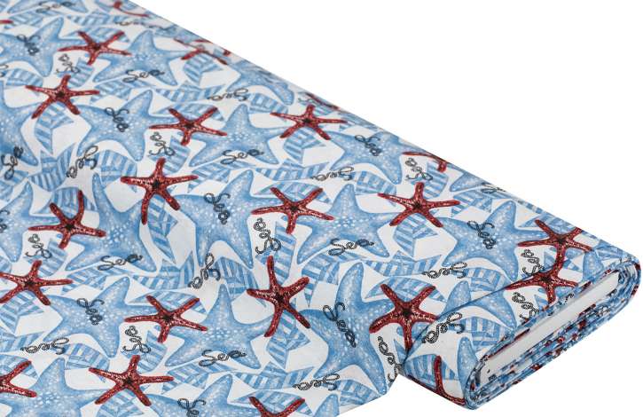 Maritimer Dekostoff "Seesterne" aus der Serie Lorena, Farbe: blau/rot, Motivgröße roter Seestern: ca. 6,5 cm Ø, Breite: 140 cm, Gewicht: ca. 170 g/m². Material: 70 % Baumwolle, 30 % Polyester.