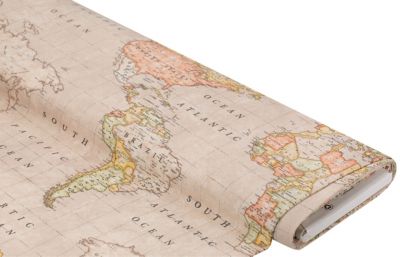 Dekostoff "Weltkarte" aus der Serie Lorena, Farbe: beige-color, Rapport: 62 cm, Motiv quer zur Webkante verlaufend, Breite: 140 cm, Gewicht: ca. 170 g/m². Material: 50 % Baumwolle, 50 % Polyester.