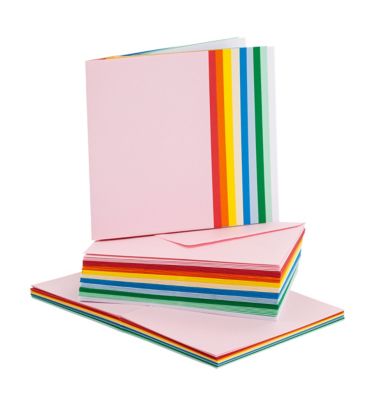Doppelkarten mit Briefhüllen, Farbe: Grundfarben, Kartengröße: 105 x 148 mm (DIN A6), Gewicht: 160 g/m², Briefhüllengröße: 114 x 162 mm (DIN C6), Gewicht: 120 g/m², Inhalt: 50 Karten und 50 Briefhüllen.