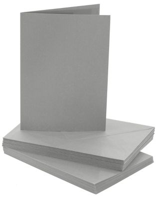 Doppelkarten mit Briefhüllen, Farbe: grau, Kartengröße: 105 x 148 mm (DIN A6), Gewicht: 240 g/m², Briefhüllengröße: 114 x 162 mm (DIN C6), Gewicht: 120 g/m², Inhalt: 50 Karten und 50 Briefhüllen.