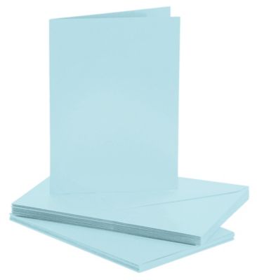 Doppelkarten mit Briefhüllen, Farbe: hellblau, Kartengröße: 105 x 148 mm (DIN A6), Gewicht: 240 g/m², Briefhüllengröße: 114 x 162 mm (DIN C6), Gewicht: 120 g/m², Inhalt: 10 Karten und 10 Briefhüllen.