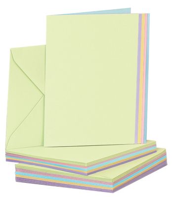 Doppelkarten mit Briefhüllen, Pastellfarben: grün, lila, blau, rosa, gelb, Kartengröße: 148 x 105 mm (DIN A6), Gewicht: 225g/m², Briefhüllengröße: 162 x 114 mm, Gewicht: 120 g/m², Inhalt: 20 Karten und 20 Briefhüllen.