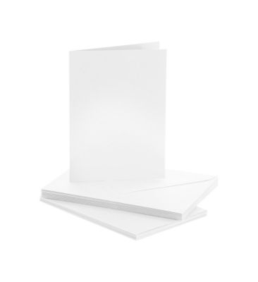Doppelkarten mit Briefhüllen, Farbe: weiß, Kartengröße: 105 x 148 mm (DIN A6), Gewicht: 240 g/m², Briefhüllengröße: 114 x 162 mm (DIN C6), Gewicht: 120 g/m², Inhalt: 10 Karten und 10 Briefhüllen.