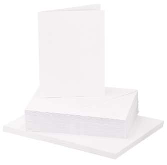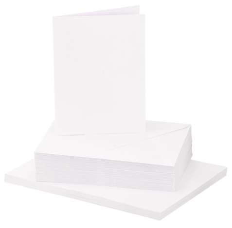 Doppelkarten mit Briefhüllen, Farbe: weiß, Kartengröße: 105 x 148 mm (DIN A6), Gewicht: 240 g/m², Briefhüllengröße: 114 x 162 mm (DIN C6), Gewicht: 120 g/m², Inhalt: 50 Karten und 50 Briefhüllen.
