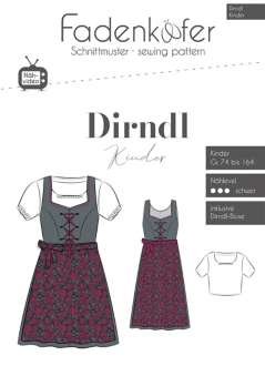 Fadenkäfer Schnitt "Dirndl" für Kinder, inkl. Schürze und Bluse, Größe 74–164, Schwierigkeitsstufe: schwer, Stoffempfehlung: Baumwollstoffe, Leinen, Samt, Seide; für die Bluse: leichte Webware wie Batist, Voile, Javanaise oder Popeline.