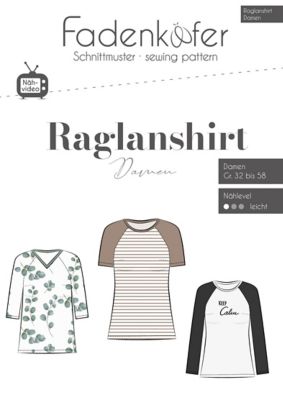 Fadenkäfer Schnitt "Raglanshirt" für Damen, Anleitung für mehrere Varianten, Größe 32–58, Schwierigkeitsstufe: leicht, Stoffempfehlung: Jersey, elastische Stoffe, Bündchenware.