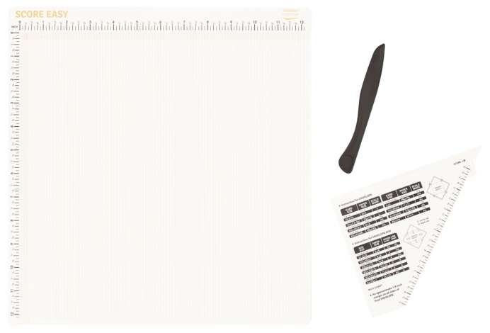 Falzbrett zur Gestaltung von Karten, Umschlägen und Boxen, geeignet für Papierstärken 120–270 g/m², mit inch-Einteilung, Größe: 30,5 x 30,5 cm, Inhalt: je 1 Falzbrett, 1 Falzbein, 1 Dreiecks-Lineal und 1 Anleitung.