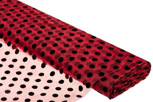 Feintüll "Tupfen", Farbe: rot/schwarz, querelastisch, transparent, mit Flockdruck, Motivgröße Punkte: 1,9 cm Ø, Breite: 150 cm, Gewicht: ca. 40 g/m². Material: 100 % Polyamid.