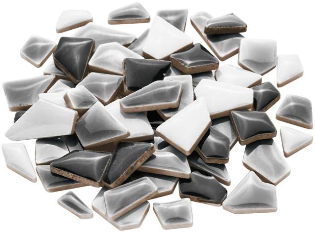 Flip Mini Keramik-Mosaik, frost- und hitzebeständig, polygonale Form, Farbe: grau-mix, Größe: 10–20 mm, Stärke: 4 mm, Inhalt: 200 g = ca. 180 Stück. Ausreichend für eine Fläche von ca. 15 x 15 cm.