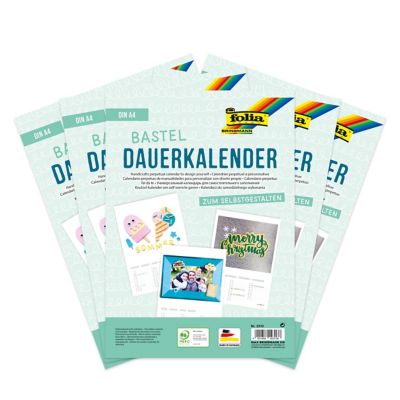 folia Bastel-Dauerkalender mit 12 Monatsblättern. Die Monatsblätter sind mit einem immerwährenden Kalendarium bedruckt. Spiralheftung mit Aufhängebügel, Farbe: weiß mit schwarzer Schrift, Größe: 21 x 29,7 cm (DIN A4), Gewicht: 130 g/m², Inhalt: 5 Stück.